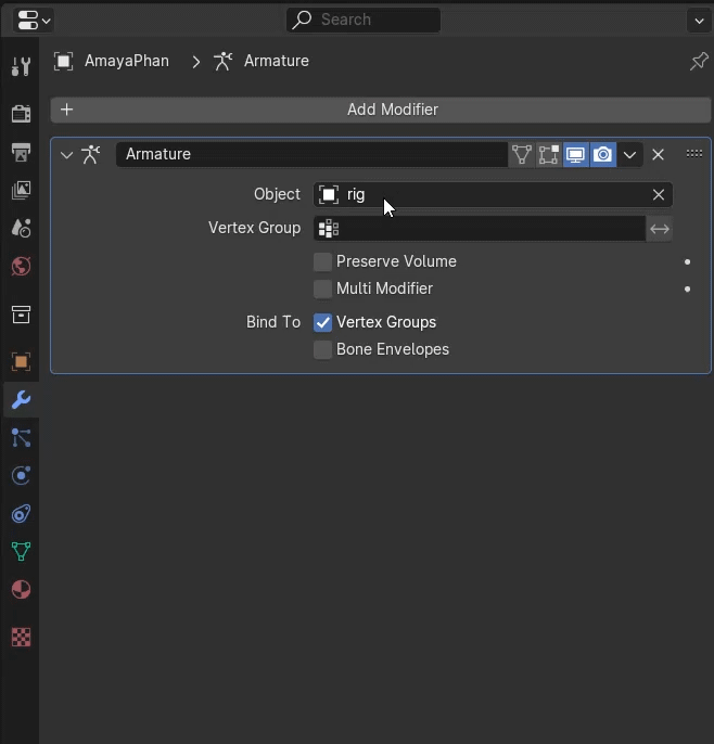 Now select your model again and go to the Modifiers tab in the right menu. There should be an Armature modifier, we are going to change our model's rig to our PosePack rig to do this;